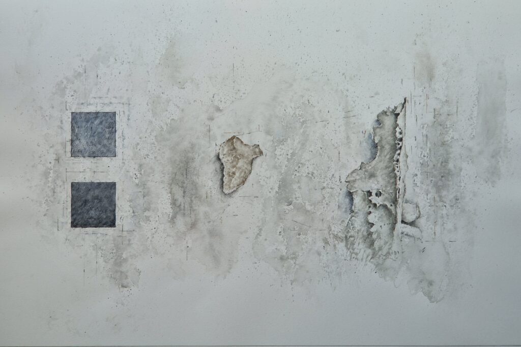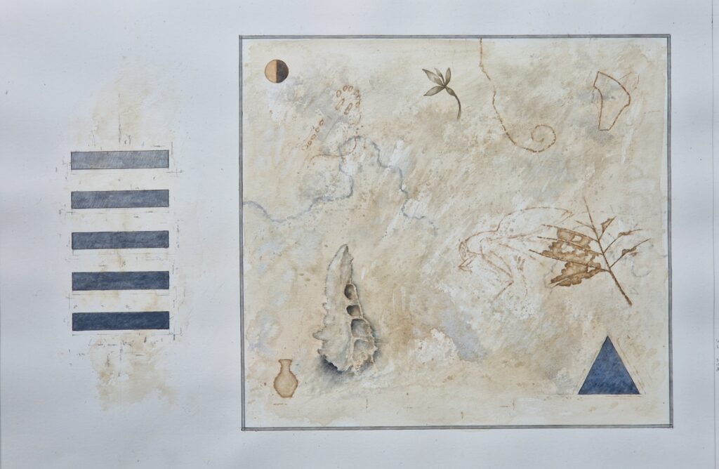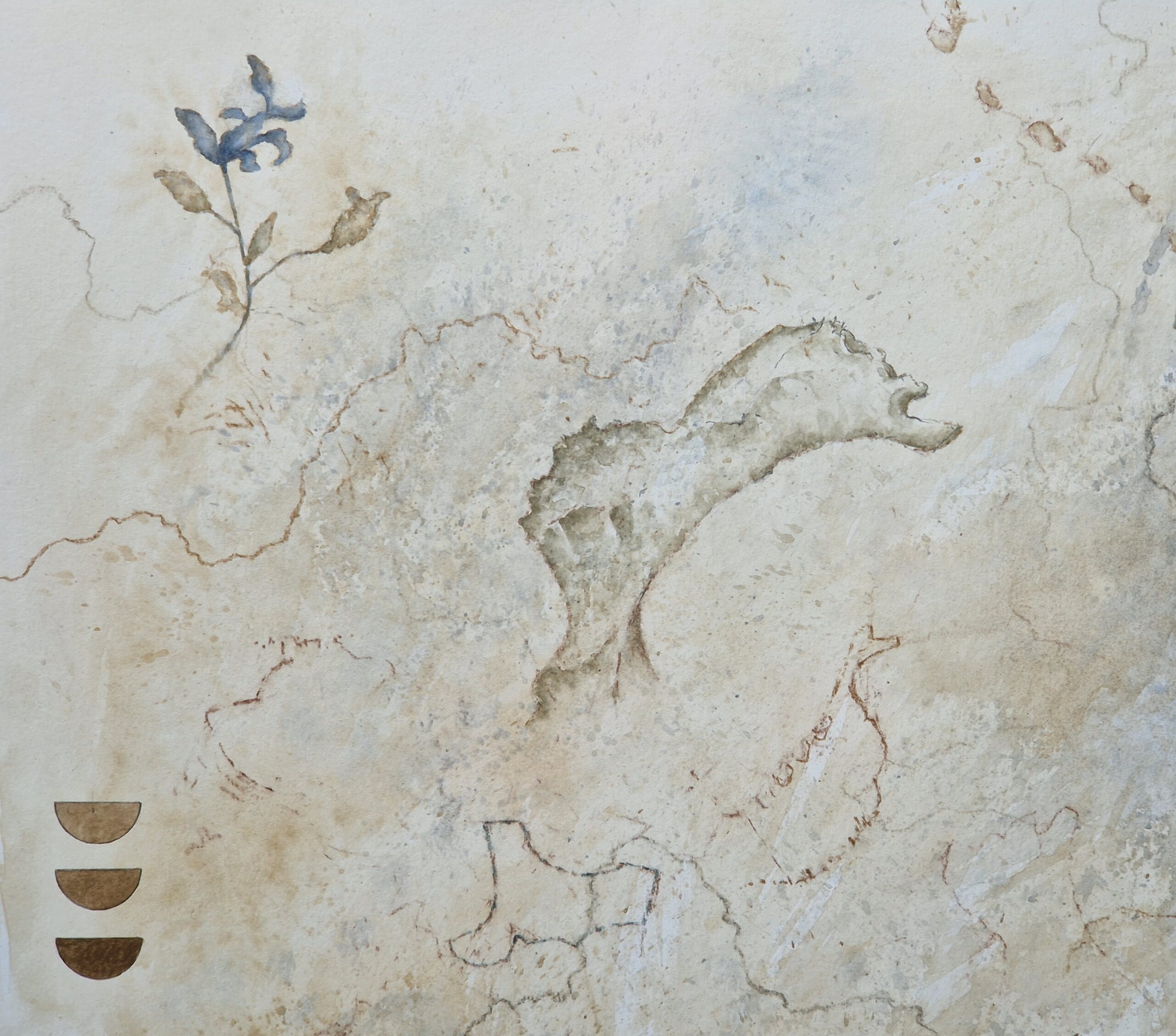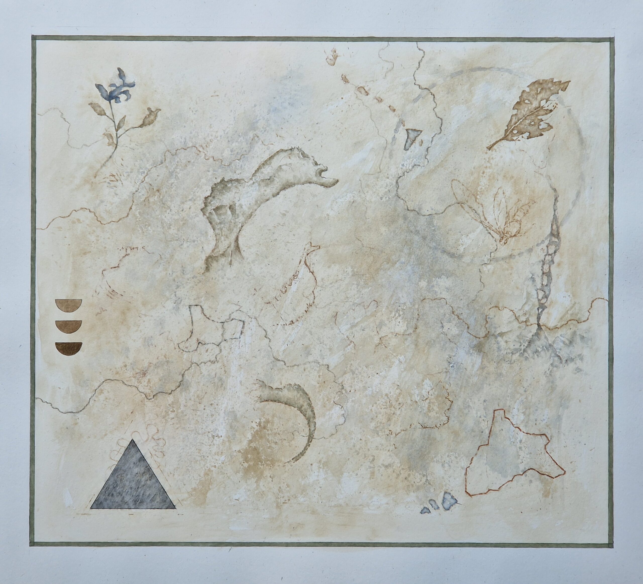Having begun to look more closely at the skeletons of leaves, as they are exposed by the elements and trodden on by passers-by, I have shifted focus to the parents – trees – a lifelong interest and solace. So, I am trying to find visual equivalents for the architecture of trees, their presence and liveliness, the way they move and dance while being tethered and rooted. The play of light on branches, twigs and leaves, and the forces of wind and rain that push and pull at them. They all have different characters and relate to each other in many varied ways. The drawings and paintings are an attempt to translate my experiences of tree beings into marks on paper. Inevitably they are always incomplete, always evocative shadows of the presence of the trees themselves. I have also embarked on a series titled, Earthsigns, evoking a sense of the layered histories to be found in the ground beneath our feet. Bringing together images of bones, rocks and plants with tracks and traces of humans and animals moving within a landscape. Somewhat reminiscent of archaeological digs…. mortality, birth and death … comings and goings … the myth of permanence within a universe of impermanence and change …